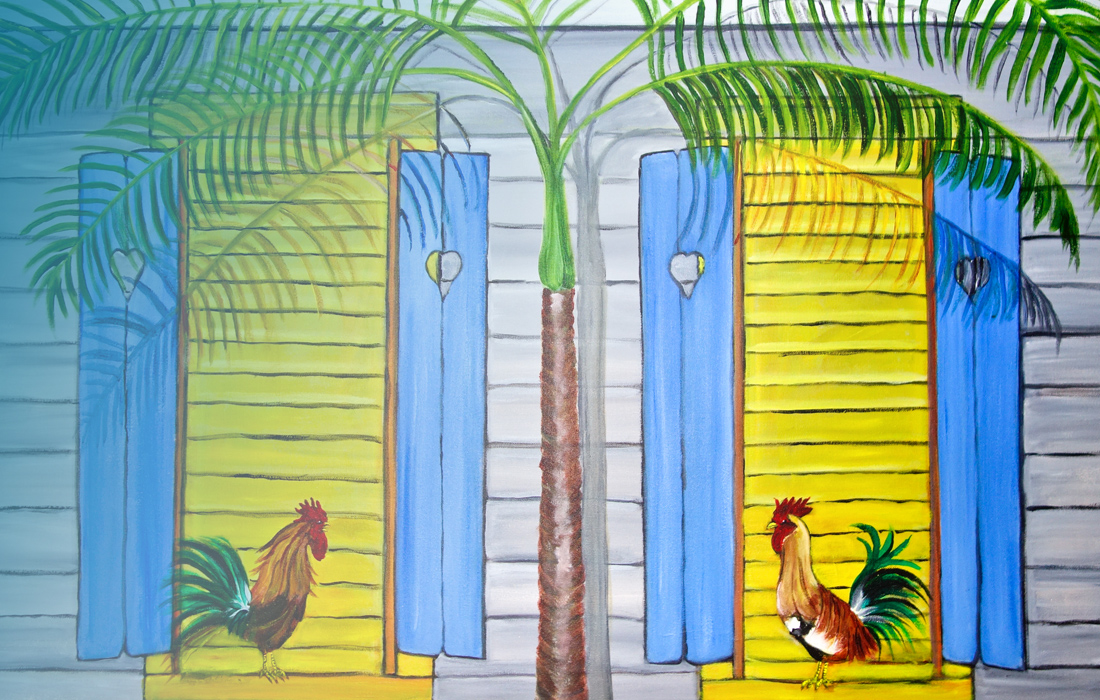 The fun and laid back Keys and Fort Myers Beach lifestyle inspired her joyful interpretations which capture the beauty and quirkiness of what she sees in her art and songwriting. She paints mainly on canvas, board and driftwood. She paints Key West and Fort Myers Beach Scenes: Key West bars, iconic Roosters and Chickens, as well as, restaurants, historic buildings and well known and appreciated flowers, plants and trees from both locations.